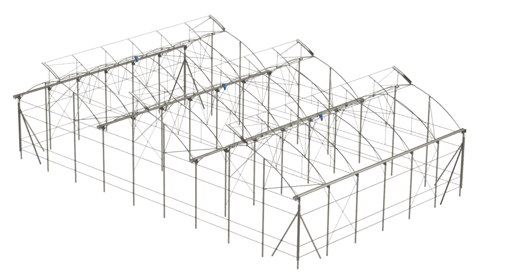 A estas ventajas se suman las innovaciones exclusivas de J. Huete Greenhouses, que combina el tubo ovalado con nuevos capiteles de diseño reforzado y pilares de 100×100. Gracias a esta integración estructural es posible alcanzar vanos de hasta 4 metros sin necesidad de cerchas intermedias, optimizando el espacio de cultivo, mejorando la ventilación y aumentando la eficiencia global del invernadero.