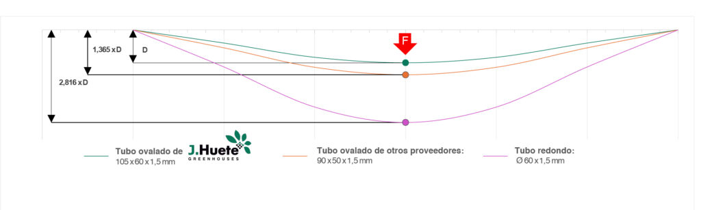 Con la misma carga, el tubo ovalado de J. Huete Greenhouses tiene una flecha 2,816 veces inferior a la del tubo redondo, y 1,365 veces inferior a la del tubo ovalado de otras marcas.